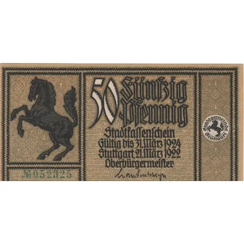 | Obverse lettering | 50 Fünfzig Pfennig Stadtkassenschein Gültig bis 31. März 1924 Stuttgart, 21 März 1922 Oberbürgermeister Stadtgemeinde Stuttgart |
