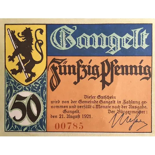 | Obverse lettering | Gangelt fünfzig pfennig Diefer Gutschein wird von der gemeinde Gangelt in zahlung genommen und verfälit 6 monate nach unsgabe Gangelt ben 21/08/1921 |
