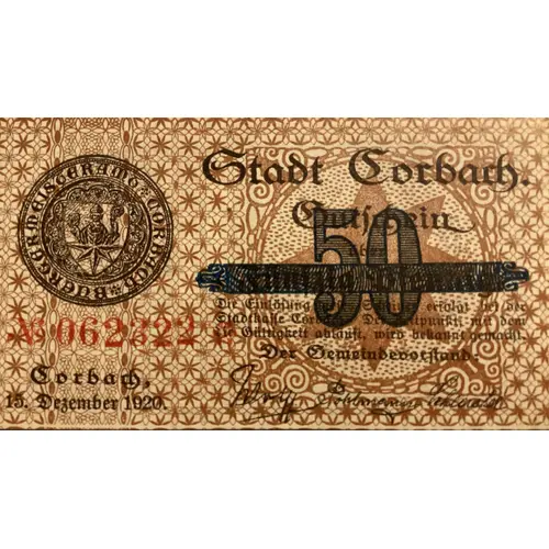 Reverse description Lettering (regular font): Stadt Corbach Gutschein 50 Fünfzig Pfennig Die Einlösung dieses Scheines erfolgt bei der Stadtkassenschein Corbach.Der Zeitpunkt,mit den sie Gültigkeit ablauft,wird bekannt gemacht Der Gemeindevorstand: Corbach,15.Dezember 1920