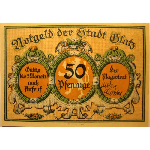 | Obverse lettering | Notgeld der stadt Glatz 50 pfennige |