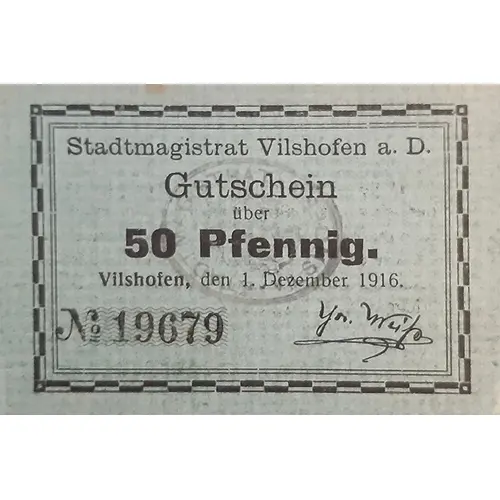 | Leyenda del anverso | Stadtmagistrat Vilshofen a. D. Gutschein uber 50 Pfennig. Vilshofen, den 1. December 1916 N° 19679 |