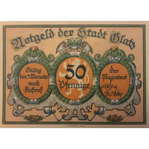 | Obverse lettering | Notgeld der stadt Glatz 50 pfennige |