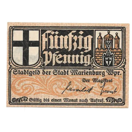 Légende de l’avers Funfzig Pfennig Stadtgeld der Stadt Marienburg WPr. (west Prussia)