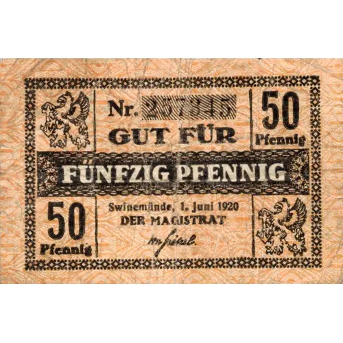 | Ön yüz lejandı | Nr. GUT FÜR FÜNFZIG PFENNIG Swinemünde,1.Juni 1919 Der Magistrat 50 Pfennig(2) |