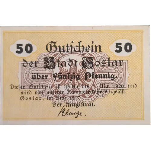 | Obverse lettering | 50 Gutschein 50 der Stadt Goslar Diefer gutschein ift gültig bis 1. mai 1920 und wird unsere kämmereifasse eindeloft Goslar, mai 1917 Der magistrat |