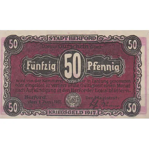 | Obverse lettering | Stadt Herford Dieser Gutschein Uber wird von der Kämmere Kasse-nier in Zahlung genommen oder eingelöst. Er verliert seme Gültigkeit einen Monat nach Aufkündigung in den Herforder Lokalblattern. Herford, den 1 Juni 1917 Kriegsgeld 1917 (Translation: City of Herford This coupon is taken in payment or redeemed by the ? cashier. It loses its validity one month after cancellation in the Herford local newspaper. Herford, June 1, 1917 War money 1917) |