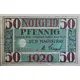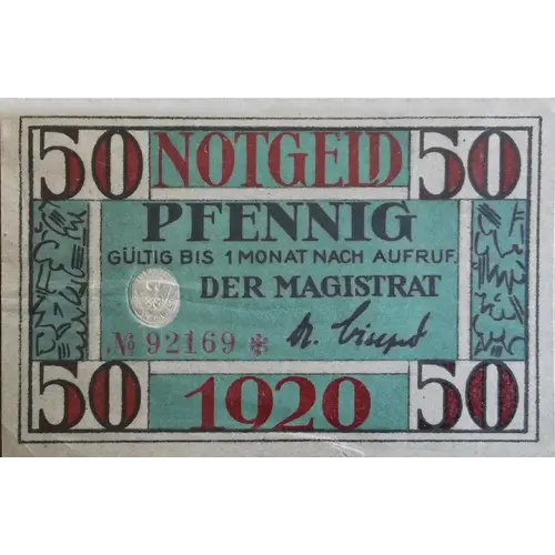 | Obverse lettering | 50 NOTGELD 50 PFENNIG GÜLTIG BIS 1 MONAT NACH AUFRUF. DER MAGISTRAT No92169 * 50 1920 50 |