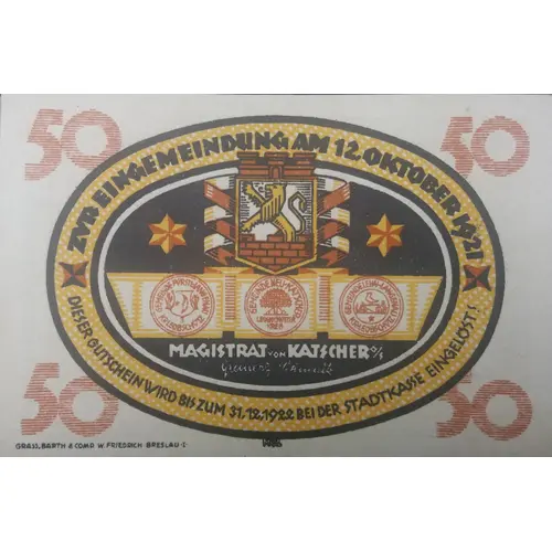 | Ön yüz lejandı | 50 50 ZVR EINGEMEINDUNG AM 12. OKTOBER 1921 MAGISTRAT VON KATSCHER DIESER GUTSCHEIN WIRD BIS ZUM 31.12.1922 BEI DER STADKASSE EINGELÖST! MOL 50 50 GRASS.BARTH & COMP. W. FRIEDRICH BRESLAU .I |