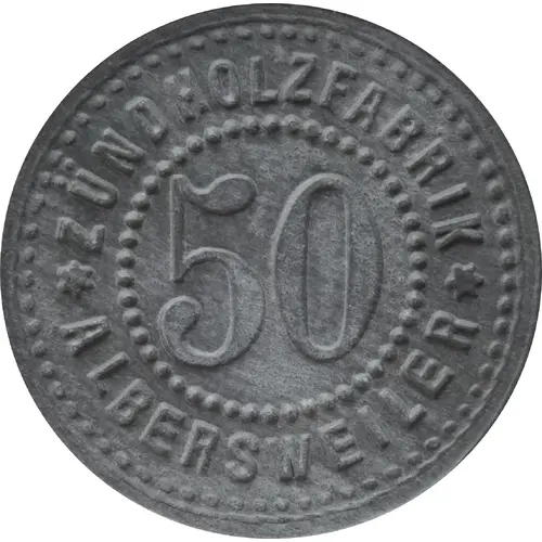| Obverse lettering | ZÜNDHOLZFABRIK 50 ✶ ALBERSWEILER ✶ |