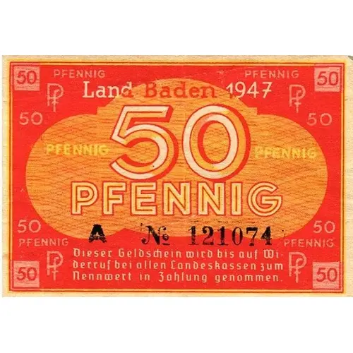 | Obverse lettering | LAND BADEN 1947 50 PFENNIG Dieser Geldschein wird bis auf Widerruf bei allen Landeskassen zum Nennwert in Zahlung genommen (Translation: This banknote will be accepted at face value at all state treasuries until revoked) |