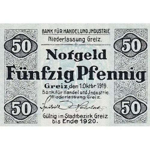 (Translation: Bank For Trade and Industry Branch Greiz. Emergency money Greiz 25 pennies 10 Bank of Commerce and Industry Greiz branch Greiz, d.1.October 1919 Valid only in the Greiz district until the end of 1920.)