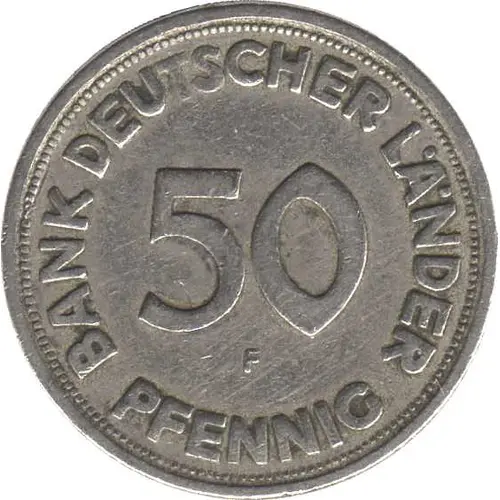 | Reverse lettering | 50 PFENNIG F BANK DEUTSCHER LÄNDER (Translation: 50 Pfennig F Bank of German States) |