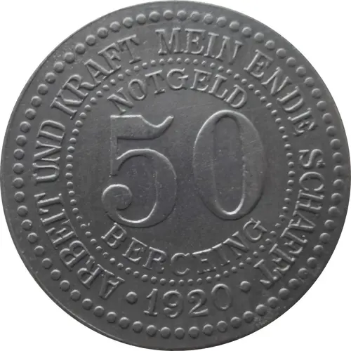 | Obverse lettering | ARBEIT UND KRAFT MEIN ENDE SCHAFFT NOTGELD 50 BERCHING ● 1920 ● |