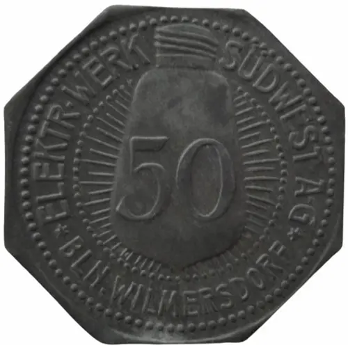 | Obverse lettering | ELEKTR ▪ WERK SÜDWEST ▪A▪G 50 ✶ BLN ▪ WILMERSDORF ✶ |