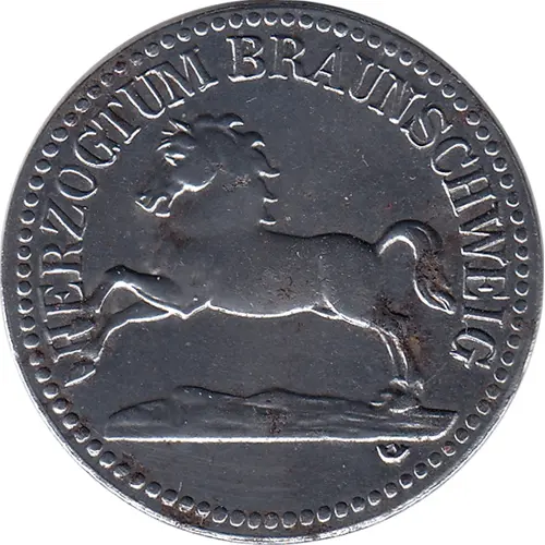 | تیراژ ضرب | 1918 - F#56.3A (oldF#56.4A) Ø24.8 mm to 25.3 mm or 25.3 mm to 25.5 mm - 1918 - F#56.3Aa) (old F#56.5) Ø24.8 - 25.3 mm - Reverse: tip of the upper line on `5` rises all the way to the top, space between 5 - 0 is 1.2 mm - 1918 - F#56.3Ab) (old 56.4Aa) Ø25.3 - 25.5 mm , Reverse: tip of the upper line on `5` rises half way to the top, space between 5 - 0 is 1.0 mm, writing on both sides wide ; Obverse: `U` in HERZOGTUM and BRAUNSCHWEIG is 1.1 mm wide, planchet is 1.0 mm th - 1918 - F#56.3Ac) (old F#56.4Ab) like b) but writing is very fine ; Av.: both `U` are 1.5 mm wide - 1918 - F#56.3Ad) (old F#56.4Ac) like b) but planchet is 1.8 mm thick - 1918 - F#56.4B Ø25.5 mm (Trial Strike: Horse with raised tail) - |