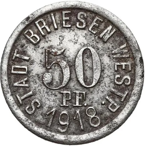 | Legenda do anverso | STADT BRIESEN WESTP. 50 PF. 1918 |