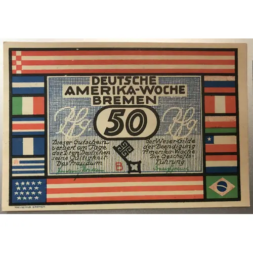 | 裏面の銘文 | DEUTSCHE AMERICA-WOCHE RIO DE JANEIRO 50 PFENNIG 50 50 PFENNIG 50 Frühjahr 1923 BREMEN Frühjahr 1923 |