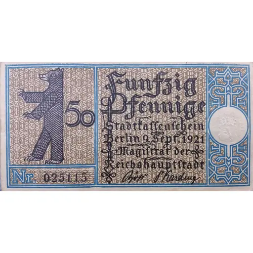 | Obverse lettering | Fünfzig Pfennige Stadtkassenschein Berlin 9. Sept. 1921 Magistrat der Reichshauptstadt (Translation: Fifty pfennigs City cash register Berlin Sept. 9, 1921 Magistrate of the Imperial Capital) |