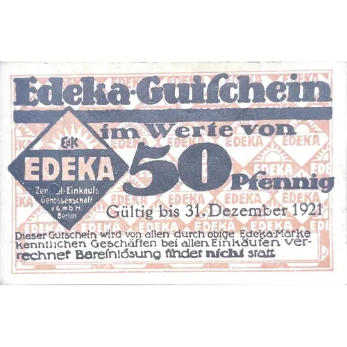 Edeka Gutschein im werte von 50 Pfennig Gültig bis 31. Dezember 1921 Dieser Gutschein wird von allen durch obige Edeka Marke kenntlichen Geschäften bei allen Einkäufen verrechner Bareiniösung finder nichi staff. Zentral Einkaufs Genossenscheft e G. m. b. H. Berlin (Translation: Edeka voucher worth 50 pfennigs Valid until December 31, 1921 This voucher will be accepted by all stores displaying the above Edeka logo for all purchases. Cash redemption is not possible. Central Purchasing Cooperative eGmbH Berlin) |