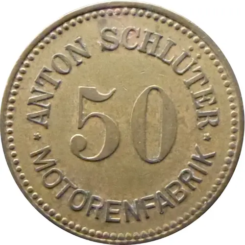 | Obverse lettering | ANTON SCHLÜTER 50 ★ MOTORENFABRIK ★ |