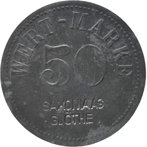 | Obverse lettering | WERT-MARKE 50 SAXONIA AG GLÖTHE |