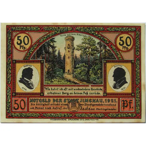 Turm auf dem Kickelhahn M. Bechstein, Ilmenau, gez. Wie kehrt ich oft mit wechselndem Geschicke, erhabner Berg an deinen Fuß zurücke. NOTGELD DER STADT ILMENAU, 1921. Die Gültigkeit erlischt einen ~ Monat nach Aufruf. ~ Der Stadtgemeindevorstand (signature: Zachäus). Oberbürgermeister. WIEDEMANNSCHE DRUCKEREI A.-G. SAALFELD A/S. |