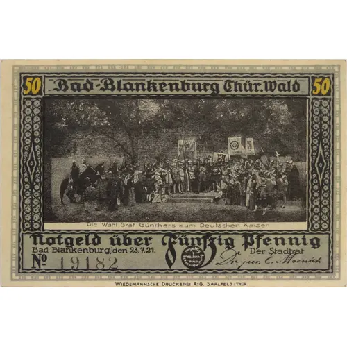 | Opis líce | 50 Bad-Blankenburg Thür.Wald 50 Notgelg über fünfzig pfennig Bad Blankenburg, den 23.7.21 Der Stradtrat |