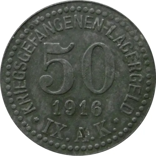 | Chữ khắc mặt trước | KRIEGSGEFANGENEN-LAGERFELD 50 1916 ★ IX.A.K. ★ |