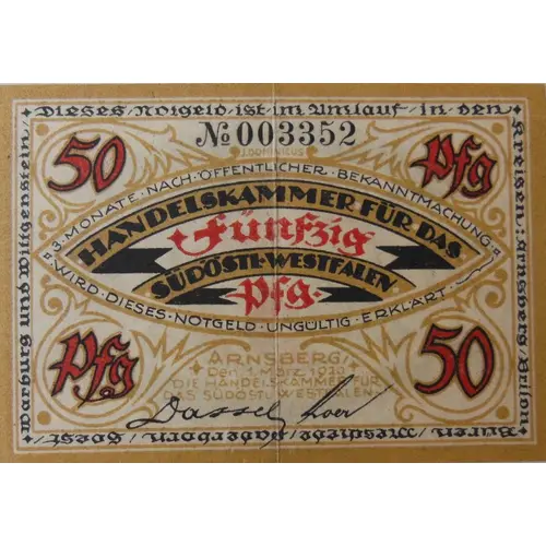 | Obverse lettering | 50 Pfennig HANDELSKAMMER FÜR DAS SÜDÖSTL. WESTFALEN * Dieses / Notgeld / ist / im Umlauf / in den* Kreisen: Arnsberg / Brilon * Büren / Meschede / Paderborn / Soest /* Warburg und Wittgenstein / ARNSBERG Den 1. März 1920. DIE HANDELSKAMMER FÜR DAS SÜDÖSTL. WESTFALEN (Translation: 50 pfennigs CHAMBER OF COMMERCE FOR THE SOUTHEAST WESTPHALIA This Notgeld is in circulation in the districts: Arnsberg, Brilon, Büren, Meschede, Paderborn, Soest, Warburg and Wittgenstein ARNSBERG March 1, 1920 CHAMBER OF COMMERCE FOR THE SOUTHEAST WESTPHALIA) |