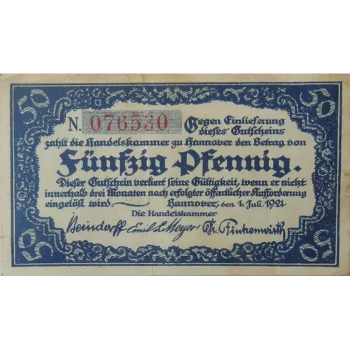 | Obverse lettering | Gegen Einlieferung diese Gutscheins zahlt die Handelskammer zu Hannover den Betrag von 50 Pfennig. Dieser Gutschein verliert seine Gültigkeit, wenn er nicht innerhalb drei Monaten nach erfolgter öffentlicher Aufforderung eingelöst wird Hannover, den 1. July 1, 1921 Die Handelskammer (Translation: When delivered this voucher the Chamber of Commerce in Hanover pays the amount of 50 pfennigs. This voucher will lose its validity if it is not redeemed within three months of being publicly requested Hanover, July 1, 1921 The Chamber of Commerce) |