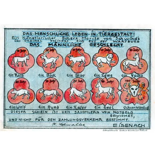| Obverse lettering | DAS MENSCHLISCHE LEBEN IN TIERGESTALT Ein Kunstlerischer Scherz Moritz vom Schwinds das Original befindet sich auf der WARTBURG 10 Jahr | 20 Jahr | 30 Jahr | 40 Jahr | 50 Jahr Ein Kalb | Ein Bock | Ein Stier | Ein Lowe | Ein Fuchs 60 Jahr | 70 Jahr | 80 Jahr | 90 Jahr | 100 Jahr Ein Wolf | Ein Hund | Ein Kater | Ein Esel | Ochsentotrenkopf DIESER SCHEIN IST DEM SAMMLERN VON NOTGELD GEWIDMET UND NICHT FUR DEN ZAHLUNGSVERKEHR BESTIMMT. K. Schwalbe | EISENACH Offsetdruck Arthur Kirchner Erfurt. |
