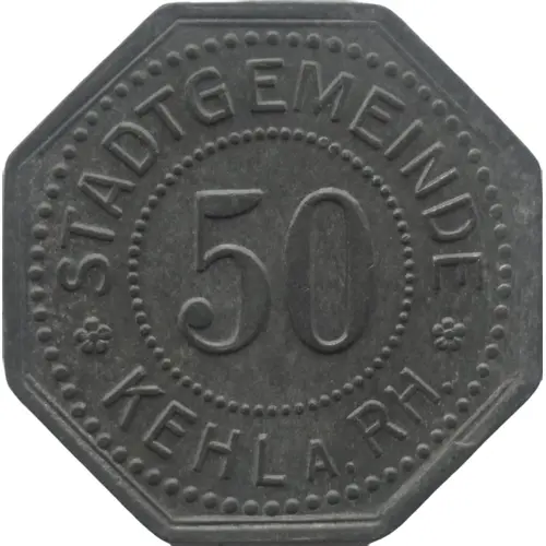 | Obverse lettering | STADTGEMEINDE 50 ✿ KEHL A .RH ✿ |