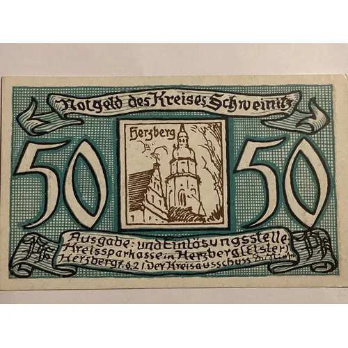 Notgeld des Kreises Schweinitz HERZBERG 50 Pf(2) Ausgabe und Einlösungstelle Kreissparkasse in Herzberg(Elster) Herzberg 1.6.21 Der Kreisausschuss |