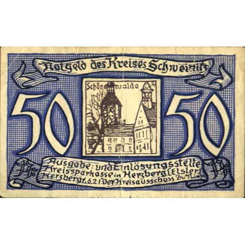 | Legenda do anverso | Notgeld des Kreises Schweinitz Schöne walde Ausgabe und Einlösungstelle Kreissparkasse im Herzberg (Elster) Herzberg 1.6.21 |
