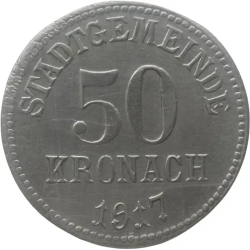 | Obverse lettering | STADTGEMEINDE 50 KRONACH 1917 |