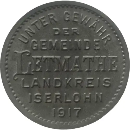 | Opis líce | UNTER GEWÄHR DER GEMEINDE LETMATHE LANDKREIS ISERLOHN 1917 |