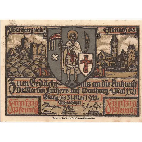 Wartburgstadt Eisenach Zum Gedächnis an die Ankunft Dr. Martin luthers auf Wartburg 4. Mai 1521 Gültig bis 31. Mai 1921 Eisenach 1921 Oberbürgermeister Stadtrat u. Kämmerer Stadtrat u. Geh.Rat Fünfzig Pfennig (Translation: Wartburg city Eisenach In memory of the arrival of Dr. Martin Luther at Wartburg May 4, 1521 Valid until May 31, 1921 Eisenach 1921 Lord Mayor City Council and Chamberlain City Council and Privy councilor Fifty pfennigs) |