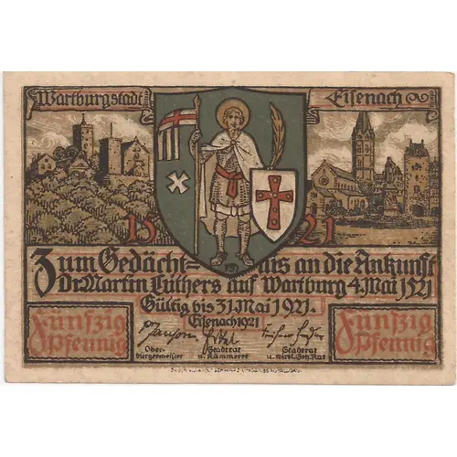 Wartburgstadt Eisenach Zum Gedächnis an die Ankunft Dr. Martin luthers auf Wartburg 4. Mai 1521 Gültig bis 31. Mai 1921 Eisenach 1921 Oberbürgermeister Stadtrat u. Kämmerer Stadtrat u. Geh.Rat Fünfzig Pfennig (Translation: Wartburg city Eisenach In memory of the arrival of Dr. Martin Luther at Wartburg May 4, 1521 Valid until May 31, 1921 Eisenach 1921 Lord Mayor City Council and Chamberlain City Council and Privy councilor Fifty pfennigs) |