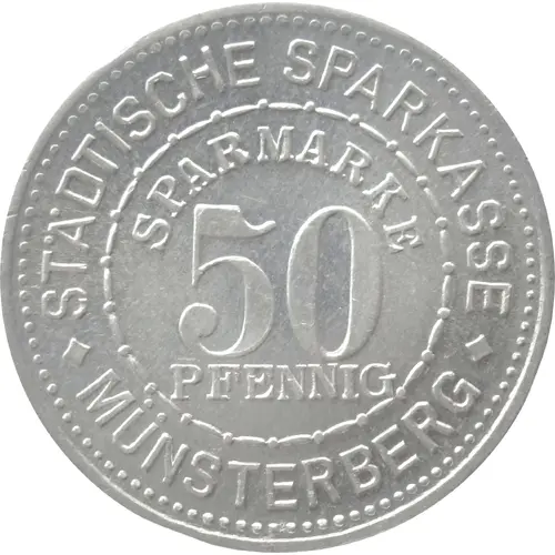 | Obverse lettering | STÄDTISCHE SPARKASSE SPARMARKE 50 PFENNIG ✦ MÜNSTERBERG ✦ |