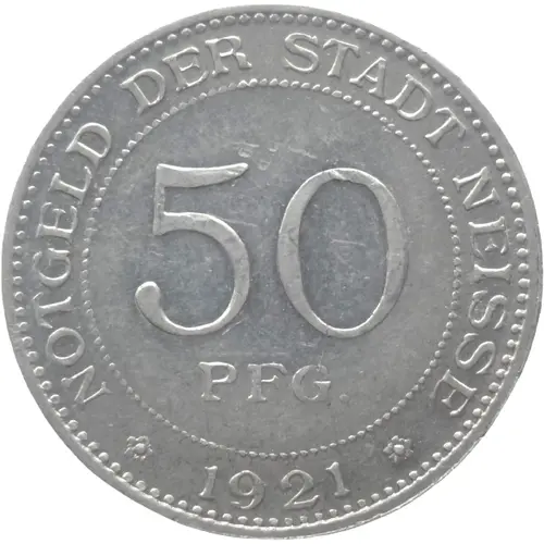 | Legenda del dritto | NOTGELD DER STADT NEISSE 50 PFG. ✿ 1921 ✿ |