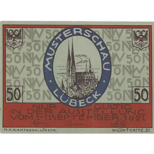 | Leyenda del anverso | MUSTERSCHAU LUBECK 50 | 50 NUR GULDIG IN DER AUSSTELLUNG VOM 1 - 11 SEPTEMBER 1921 |
