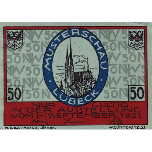 | Opschrift voorzijde | MUSTERSCHAU LUBECK 50 | 50 NUR GULDIG IN DER AUSSTELLUNG VOM 1 - 11 SEPTEMBER 1921 |