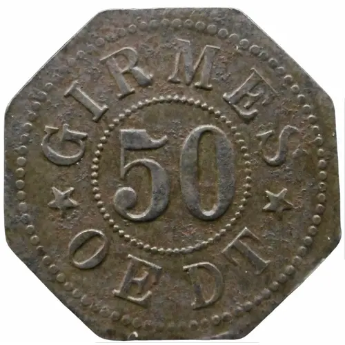 Artistry: While the engraver for this specific Oedt-Girmes issue is typically unrecorded, the design aesthetic generally aligns with the utilitarian yet often locally expressive character of Notgeld. Such emergency issues frequently feature the issuing municipality's name, denomination, and sometimes local landmarks, coats of arms, or symbols of regional industry, in this case, potentially referencing Oedt-Girmes's textile heritage. The stylistic school leans towards a pragmatic, often folk-art approach, prioritizing clear communication over intricate detail, a necessity given the production constraints and the base metal used.