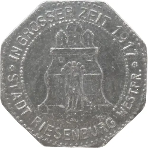 | Legenda do anverso | IN GROSSER ZEIT 1917 ✿ STADT RIESENBURG WESTPR. ✿ |