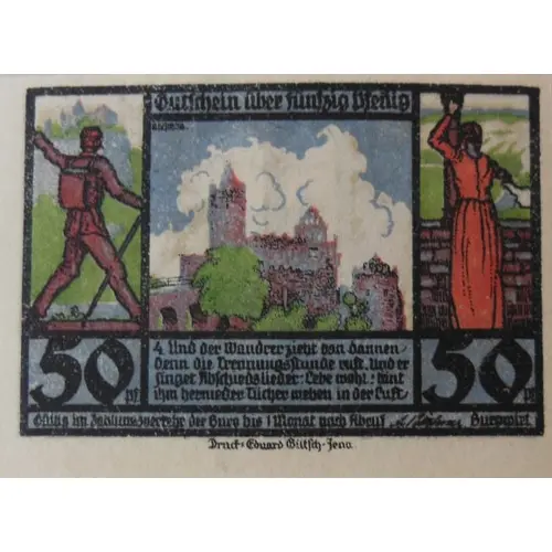 Gutschein über fünfzig Pfenig 4. Und der Wandrer zieht von dannen, denn die Trennungsstunde naht. Und er singet Abschiedslieder: Lebe wohl! tönt ihm hernieder. Tücher wehen in der Luft, 50 Pf. Gültig im Zahlungsverkehr der Burg bis 1 Monat nach Aufruf Burgwirt (Translation: Voucher for fifty pfennigs 4. And the hiker moves from there, because the separation hour is approaching. And he singet farewell songs: Live well! Sounds down to him. Cloths blow in the air, 50 pfennigs Valid in payment transactions of the castle up to 1 month after call Host of the castle) |