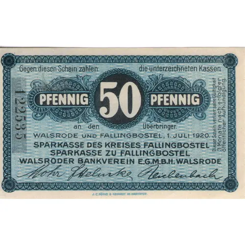 | Obverse lettering | Gegen diesen Schein zahlen die unterzeichneten Kassen PFENNIG 50 PFENNIG an den Überbringer. Dieser Schein verliert seine Gültigkeit 3 Monate nach erfolgter öffentlicher Aufkündigung. WALSRODE UND FALLINGBOSTEL, 1. JULI 1920. SPARKASSE DES KREISES FALLINGBOSTEL SPARKASSE ZU FALLINGBOSTEL WALSRODER BANKVEREIN E.G.M.B.H. WALSRODE J.C. KÖNIG & EGHARDT IN HANNOVER. |