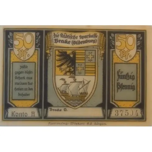 50 Pf. Die städtische Sparkasse Brake (Oldenburg) zahle gegen diesen Scheck aus meinem Guthaben an den Inhaber fünfzig Pfennig Konto A Brake O. (Translation: 50 pfennigs The municipal savings bank of Brake (Oldenburg) pay fifty pfennigs against this cheque from my balance to the holder Account A Brake in Oldenburg) |