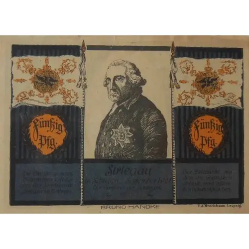 Fünfzig Pfg. Die Einlösung dieses Gutscheines erfolgt bei der Stadtbank Striegau im Rathaus. Striegau in Schlesien - September 1921 Der Vorstand der Stadtbank Der Zeitpunkt, mit dem die Gültigkeit abläuft, wird öffentlich bekanntgegeben. (Translation: Fifty pfennigs This voucher will be redeemed at the city bank of Striegau in the town hall. Striegau in Silesia - September 1921 The board of the city bank The date on which the validity expires will be announced publicly.) |