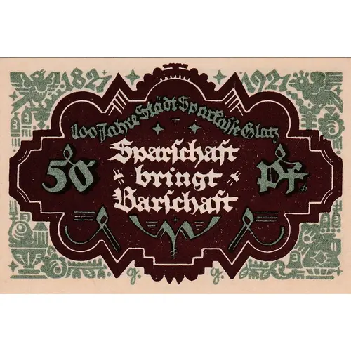 (Translation: 100 years of the Municipal Savings Bank Glatz. Savings brings cash. 50 Pfennig.) |
