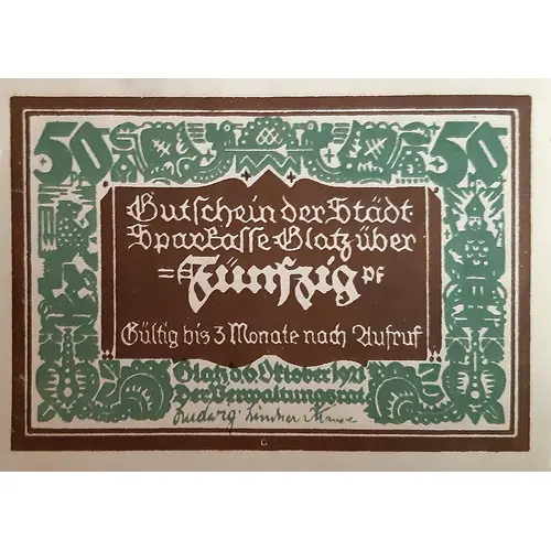 | Obverse lettering | Gutschein der Städt Sparkasse Glatz über funfzig pf Gültig bis 3 monate nach dutruf Glatz, 06. Oktober 1921 |